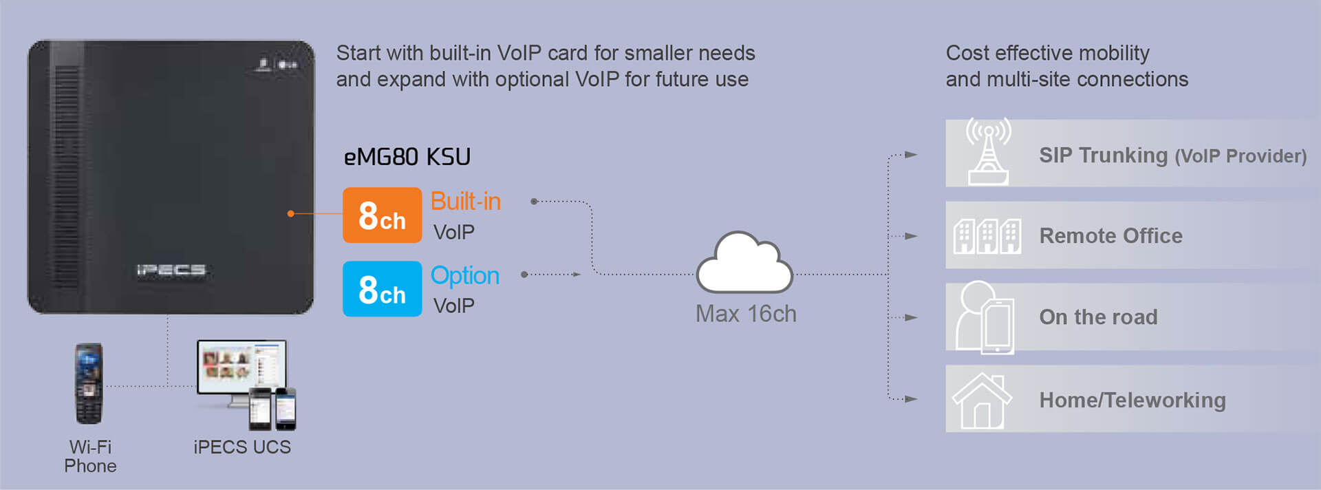 With the iPECS eMG80 you can start small with 2-12 users and grow seamlessly to more than 100 ports. iPECS eMG80 delivers cost effective communications to small and growing businesses and affordable expandability to medium-size businesses.